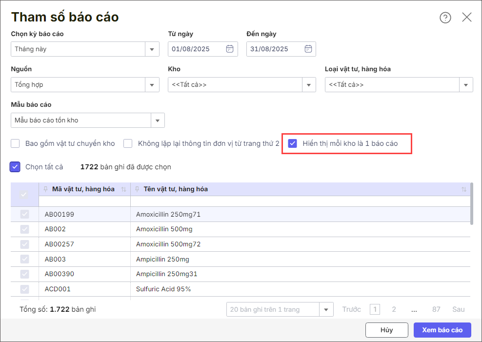 Bước 2: Khai báo tham số in báo cáo, lưu ý tích chọn Hiển thị mỗi kho là 1 báo cáo.