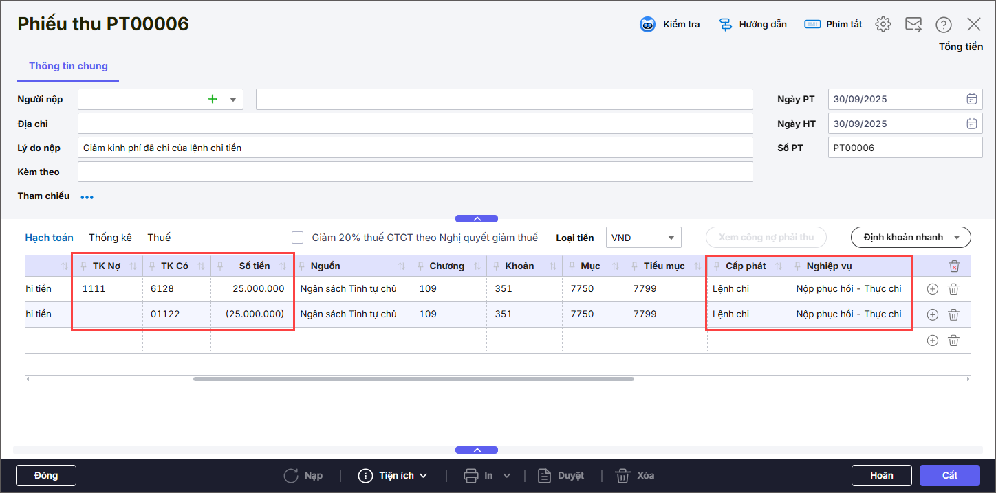 - Nếu khôi phục khoản đã rút: chọn cột nghiệp vụ là Nộp trả– Tạm ứng hoặc Nộp trả – Thực chi, chọn cột Cấp phát là Lệnh chi.