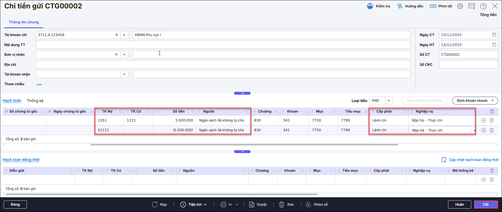 - Nhập chi tiết chứng từ: TK Nợ, TK Có, Số tiền, Nguồn, Chương, Khoản, Tiểu mục.