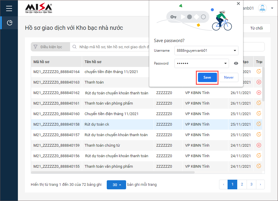 Sau khi anh/ chị nhập thông tin và đăng nhập thành công vào trang https://dvc.misa.vn trên trình duyệt Google Chrome, trình duyệt sẽ hiển thị thông báo hỏi bạn có muốn lưu mật khẩu (Save password?) hoặc thông tin đăng nhập không.