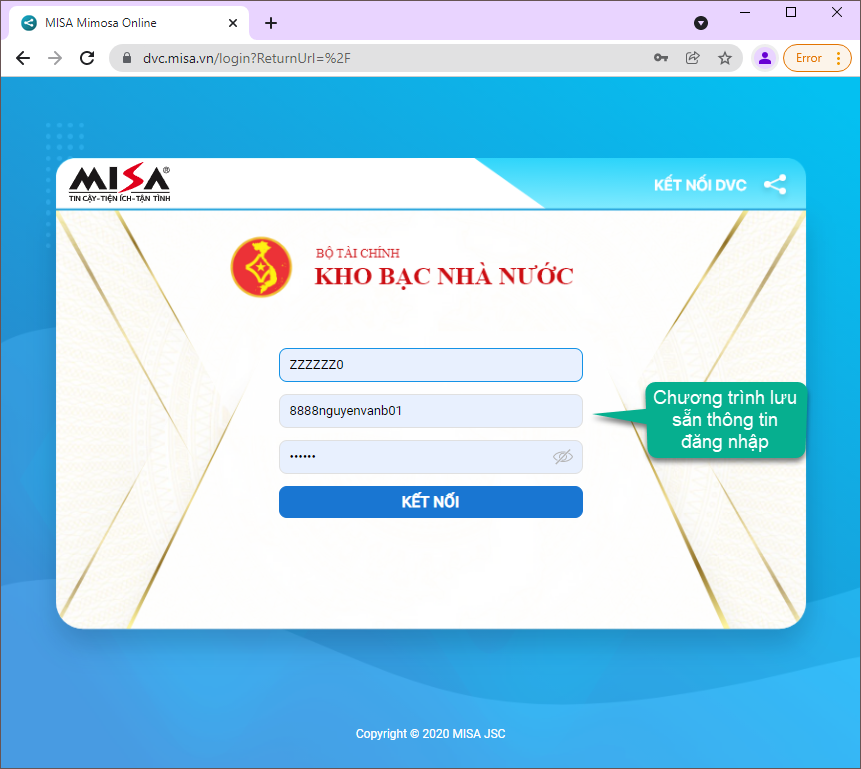 Kể từ lần đăng nhập tiếp theo, khi truy cập vào trang https://dvc.misa.vn , trình duyệt Google Chrome sẽ tự động gợi ý hoặc điền sẵn các thông tin như Mã QHNS, Tên đăng nhập đã được lưu.