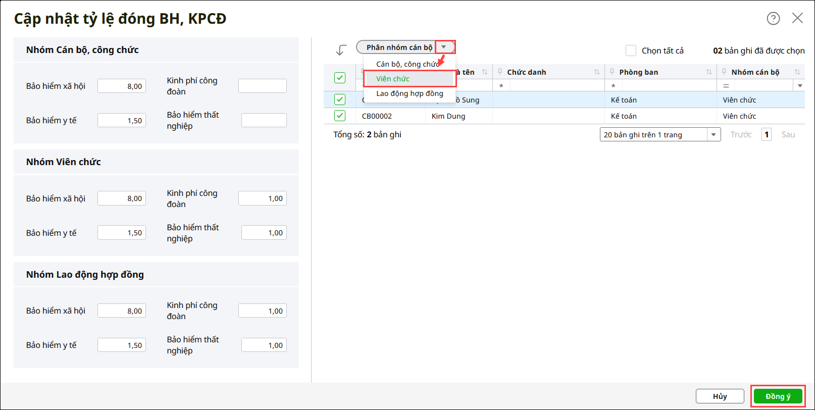 • Để phân nhóm cán bộ tương ứng với từng tỷ lệ đóng BH, KPCĐ thì làm như sau: