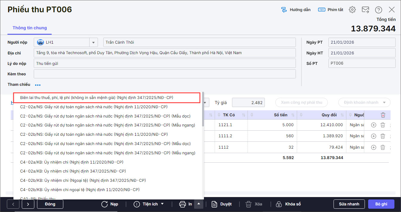 • Mẫu số 05: Biên lai thu thuế, phí, lệ phí (không in sẵn mệnh giá): In tại chứng từ Thu tiền gửi, Phiếu thu.