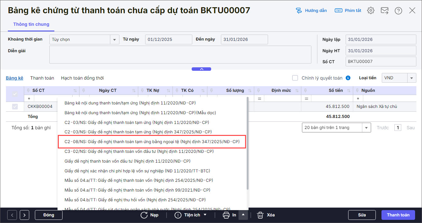 • Mẫu số 11 (C2-08/NS): Giấy đề nghị thanh toán tạm ứng bằng ngoại tệ: In tại Bảng kê chứng từ thanh toán đã cấp dự toán, Bảng kê chứng từ thanh toán chưa cấp dự toán.