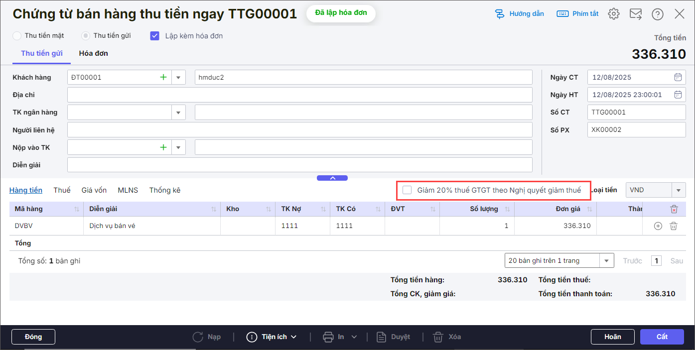Bổ sung tùy chọn “Giảm 20% thuế GTGT theo Nghị quyết giảm thuế” trên chứng từ khi áp dụng phương pháp tính thuế trực tiếp.