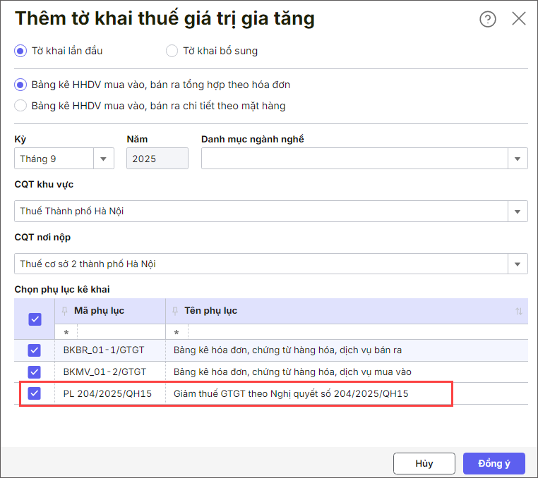 Bổ sung phụ lục Giảm thuế GTGT theo Nghị quyết 204/2025/QH15 trên tờ khai thuế.