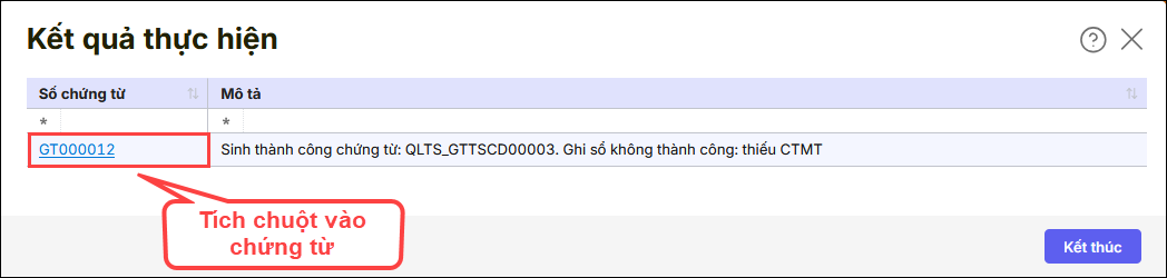 Khi lấy chứng từ từ phần mềm MISA QLTS sang phần mềm MISA MIMOSA ONLINE có cảnh báo lỗi ghi sổ chứng từ không thành công do thiếu CTMT thì anh/chị kiểm tra theo 2 nguyên nhân sau: