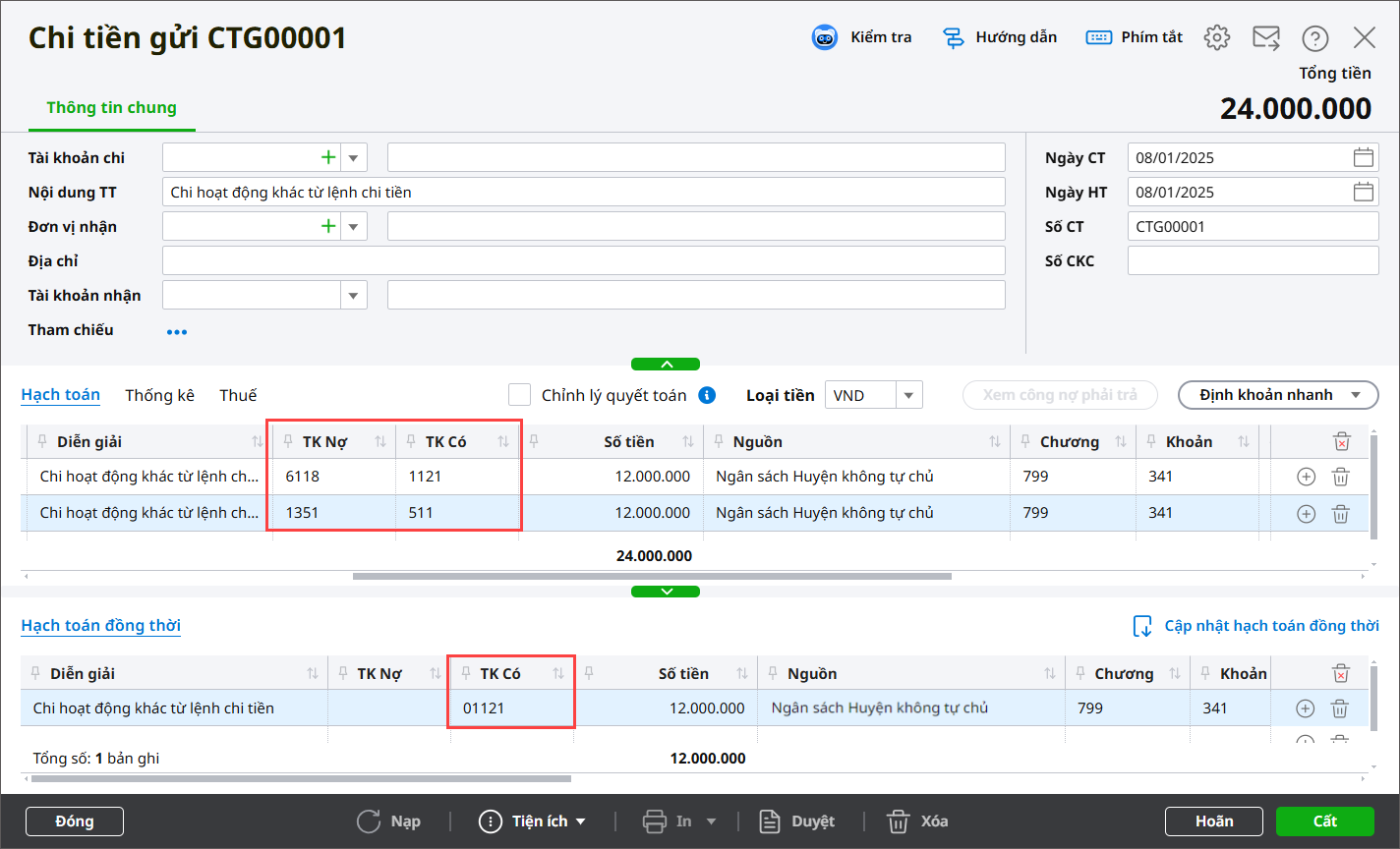 - Tài khoản chi: lựa chọn hoặc khai báo thêm tài khoản ngân hàng, kho bạc chi tiền.