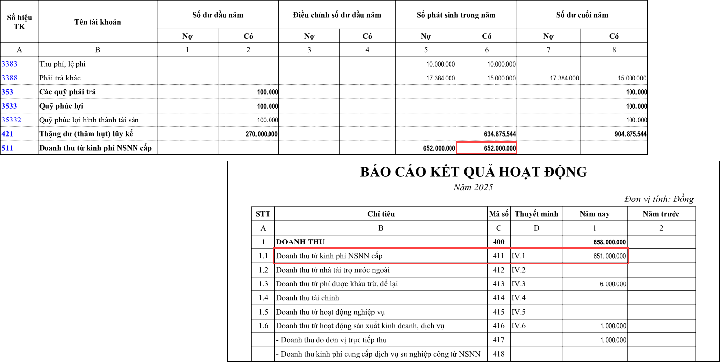 Bài viết này hướng dẫn anh/chị kiểm tra nguyên nhân và cách xử lý trong trường hợp so sánh chỉ tiêu 411 Doanh thu từ kinh phí NSNN cấp (mã số 411) trên Báo cáo B02/BCTC – Báo cáo kết quả hoạt động không bằng tổng phát sinh Có TK 511 trên báo cáo S05-H – Bảng cân đối số phát sinh, giúp kế toán xác định đúng sai lệch và điều chỉnh kịp thời.
