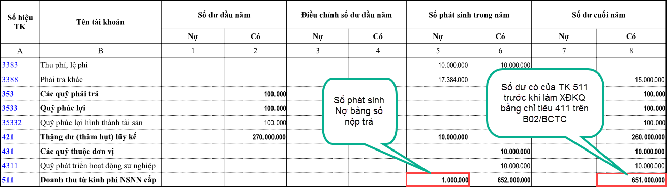 – Căn cứ lấy số liệu chỉ tiêu Doanh thu từ kinh phí NSNN cấp (mã số 411) trên B02/BCTC là tổng số phát sinh bên Nợ TK 511 đối ứng với bên có TK 911 (Bút toán xác định kết quả hoạt động trên phần mềm). Là số thực thu sau khi đã trừ số hoàn trả giảm thu.