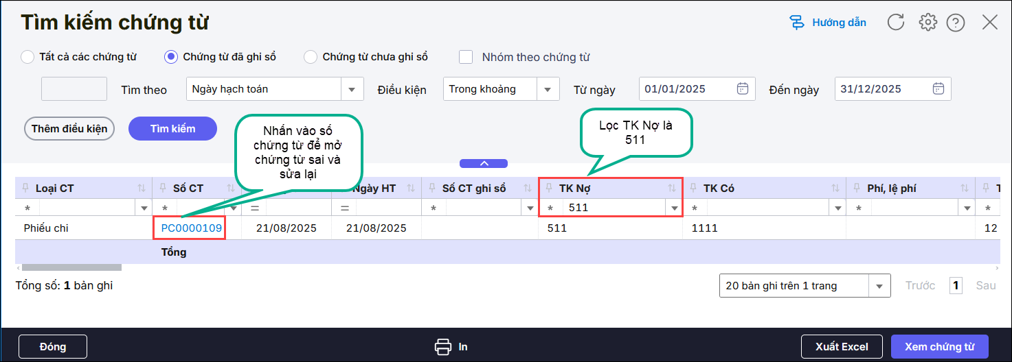 ♦ Nếu số phát sinh Nợ không đúng với thực tế phát sinh nghiệp vụ giảm thu do nộp trả thực tế phát sinh thì anh/chị vào tìm kiếm chứng từ giảm thu và kiểm tra lại theo hướng dẫn tại đây, lọc tài khoản Nợ 511, tài khoản Có khác 911. Nhấn vào số chứng từ để mở chứng từ sai lên rồi thực hiện sửa lại nếu sai, bỏ nếu thừa, thiếu thì bổ sung.