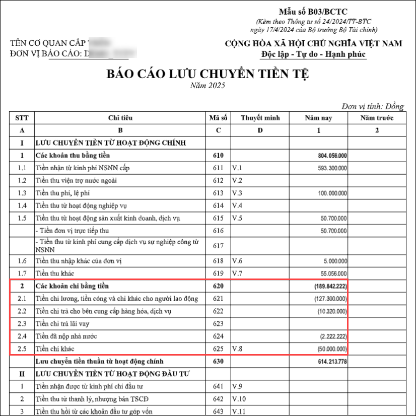 Theo hướng dẫn của thông tư 24 ,Các khoản chi (mã số 620), Tiền chi lương, tiền công và các chi khác cho người lao động(mã số 621),Tiền chi trả bên cung cấp hàng hóa ,dịch vụ(mã số 622),Tiền chi trả lãi vay ( mã số 623), Tiền đã nộp nhà nước ( mã số 624),Tiền chi khác (mã số 625) …phản ánh các khoản đơn vị đã chi ra bằng tiền phát sinh trong kỳ báo cáo làm giảm tiền của đơn vị và được ghi bằng số âm dưới hình thức ghi trong ngoặc đơn.
