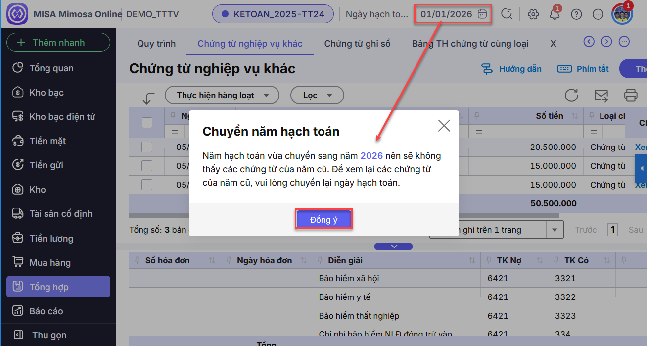 • Nếu phần mềm cảnh báo chuyển năm hạch toán, nhấn Đồng ý.