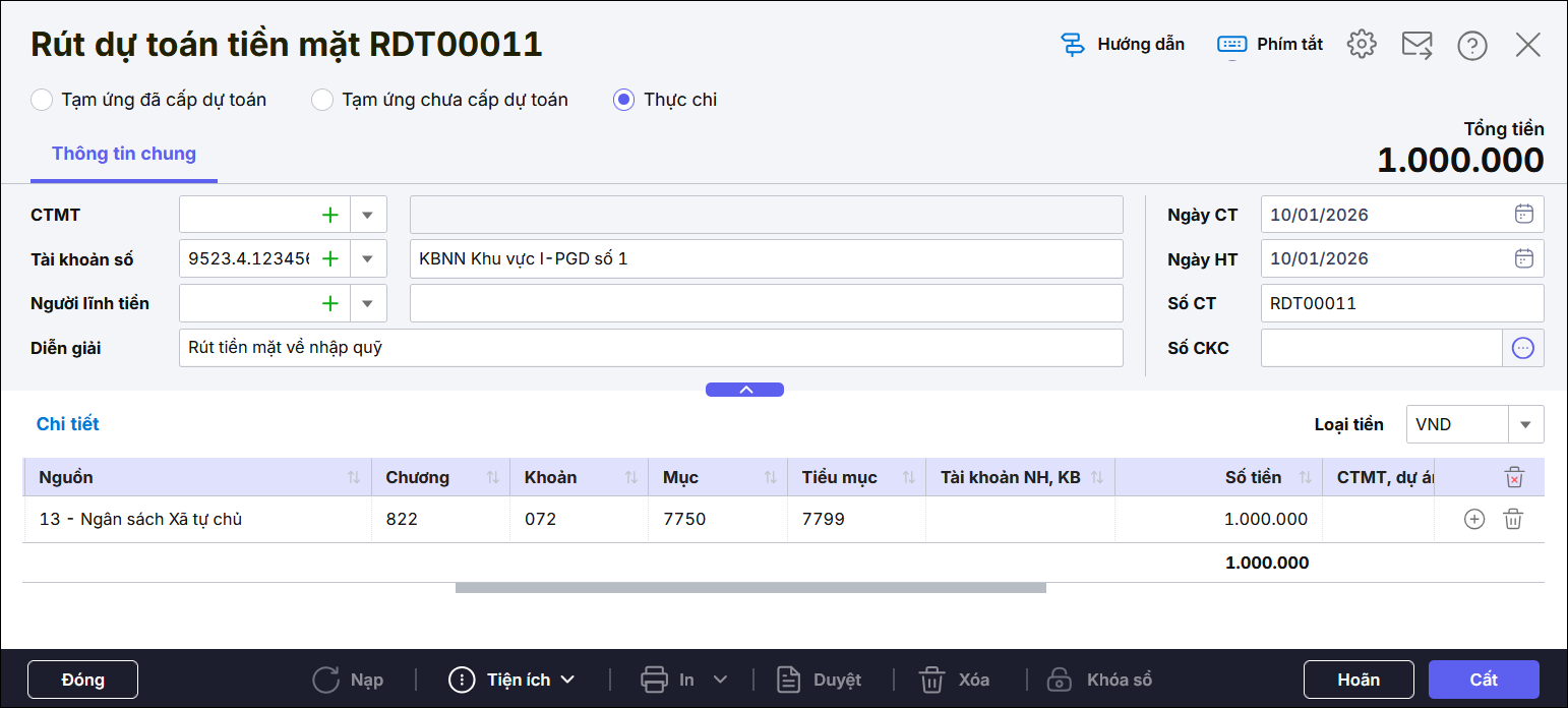 • Trên chứng từ khai báo thêm các thông tin: Tài khoản số, Diễn giải, Nguồn, Chương, Khoản, Mục, Tiểu mục, Số tiền.