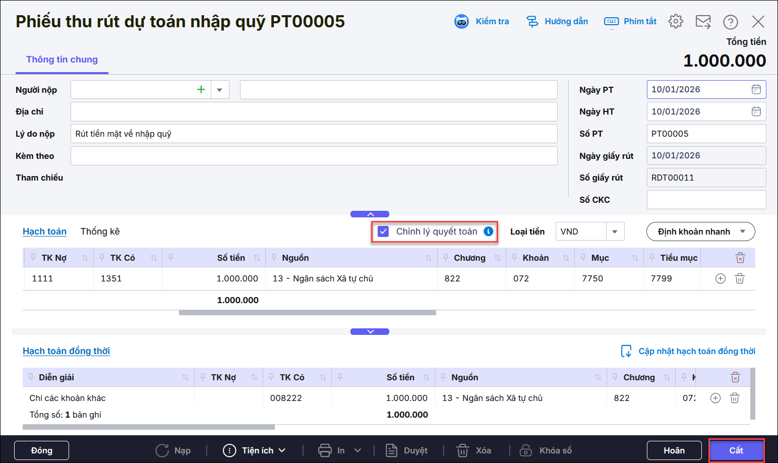 • Nhấn Cất sẽ sinh chứng từ phiếu thu rút dự toán nhập quỹ hoặc chuyển khoản kho bạc tương ứng. Tích chọn ô Chỉnh lý quyết toán trên chứng từ.