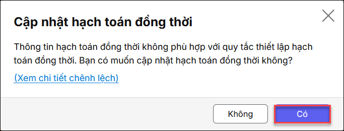 Nếu phần mềm báo cập nhật hạch toán đồng thời thì nhấn  để sinh lại hạch toán tài khoản ngoại bảng về tài khoản năm trước 008121, 008122, 008111, 008112.