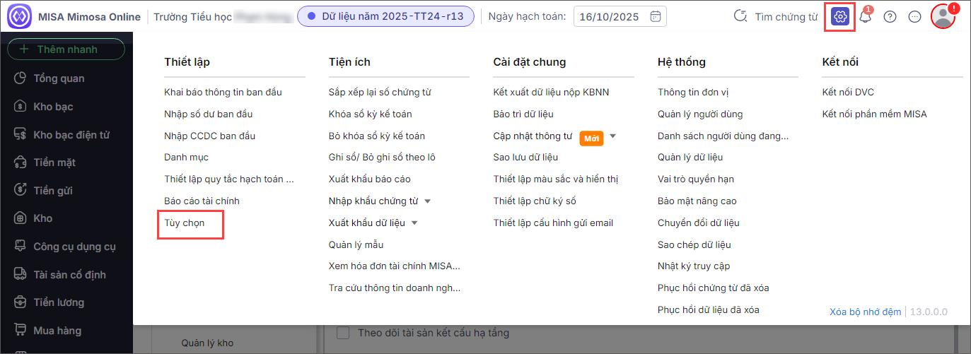 Bước 1: Vào biểu tượng bánh răng ⚙ ( góc phải phía trên )Thiết lập\Tùy chọn.