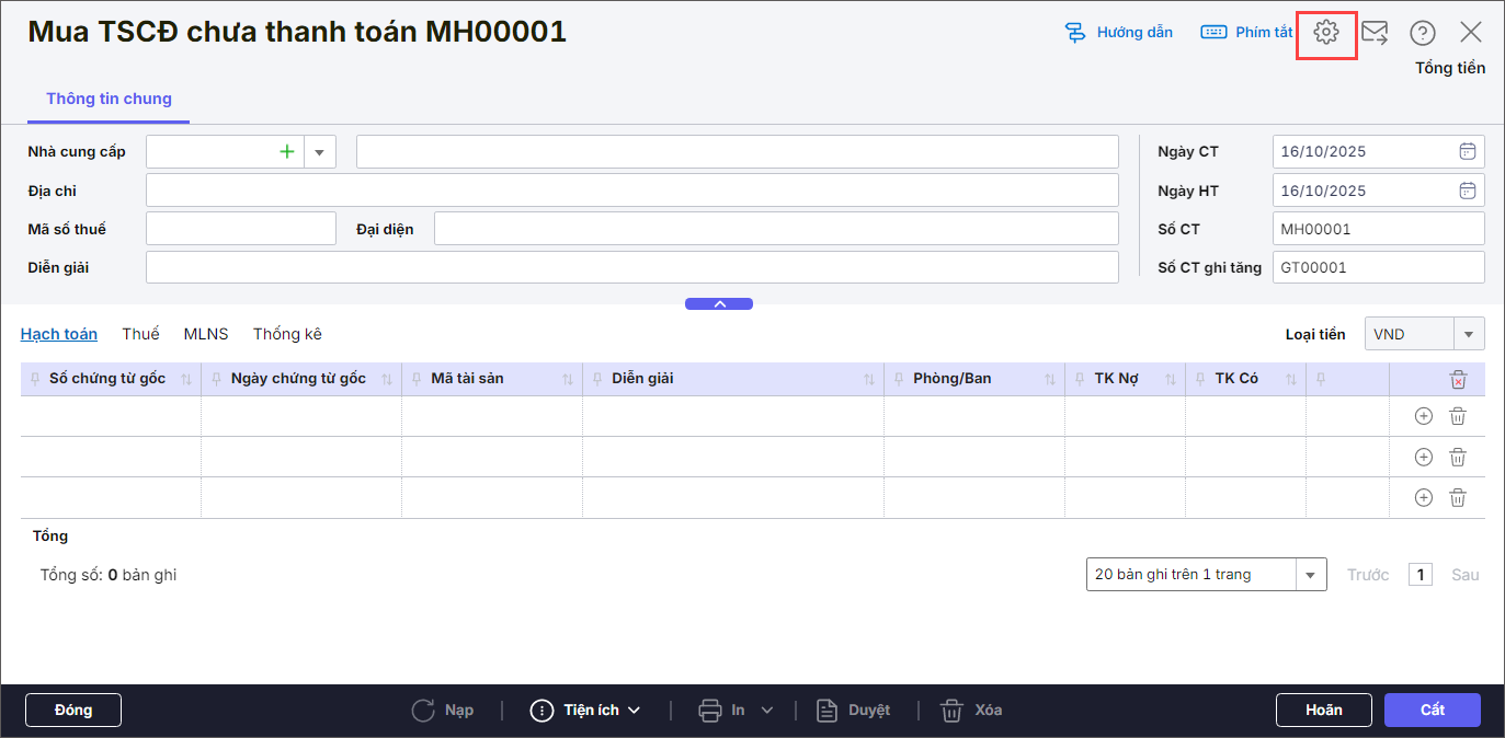 Bước 4: Trên chứng từ Mua TSCĐ chưa thanh toán, nhấn vào biểu tượng bánh răng (góc phải phía trên của chứng từ ) Tùy chỉnh giao diện