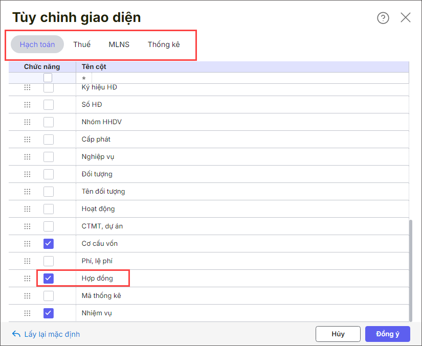 Bước 6: Tích chọn vào cột Hợp đồng để hiển thị cột này trên mục Hạch toán của chứng từ.