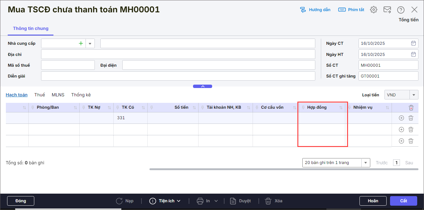 Từ các lần sau khi phát sinh chứng từ Mua TSCĐ chưa thanh toán, anh/chị chọn hợp đồng tương ứng cho từng dòng hạch toán rồi nhấn Cất