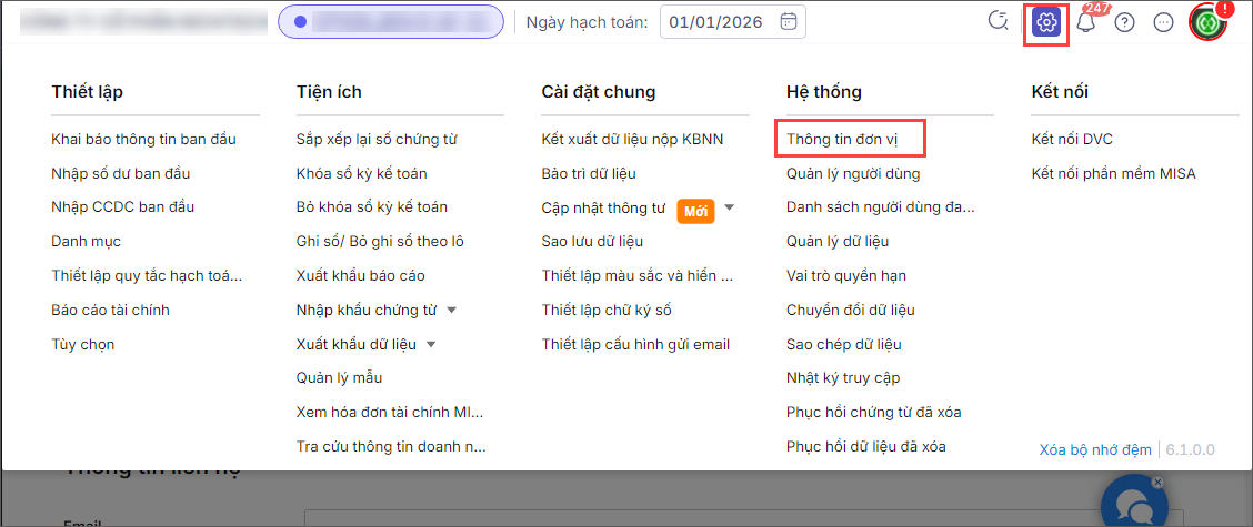 Bước 1: Vào biểu tượng Bánh răng ⚙️(góc phải phía trên)Thiết lập\Thông tin đơn vị.