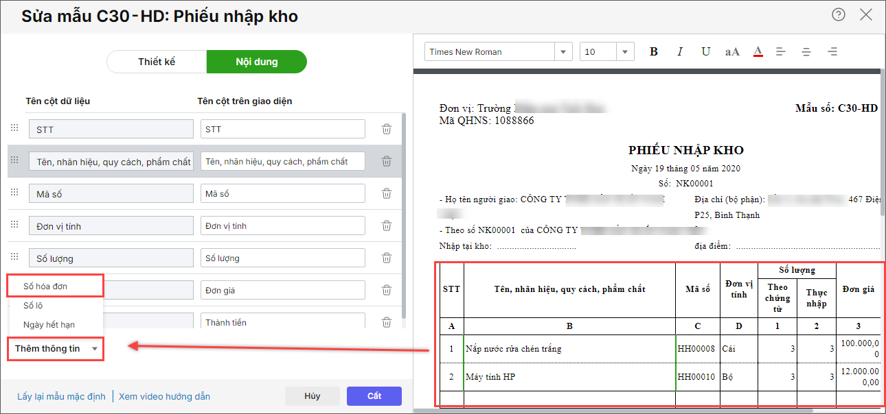 Bước 2: Tại chức năng Sửa mẫu C30-HD: Phiếu nhập kho tích sang phần Nội dung