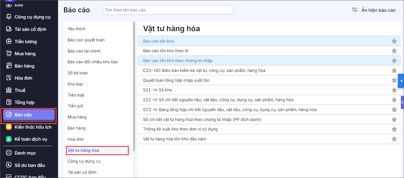 Bước 1: Vào menu Báo cáo\Vật tư hàng hóa\Kích đúp chuột vào báo cáo tồn kho cần in.
