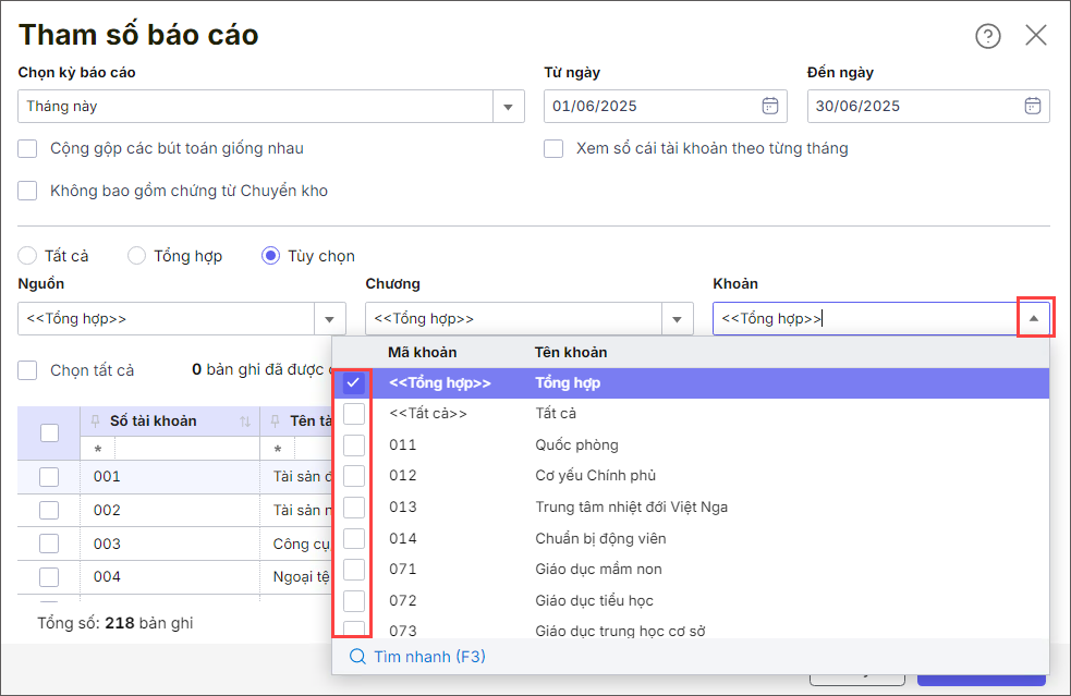Bước 2: Trên tham số báo cáo, tại mục Khoản, anh/chị tích chọn vào 1 hoặc nhiều khoản cần in báo cáo.