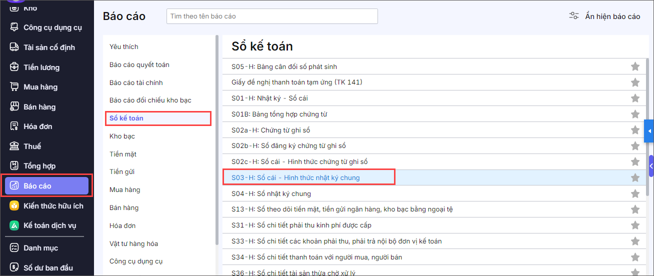 Bước 1: Vào menu Báo cáo\Sổ kế toán\Kích đúp chuột vào báo cáo S03-H.