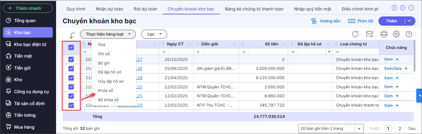 - Hoặc cho nhiều chứng từ cùng lúc bằng cách tích chọn nhiều chứng từ , nhấn Thực hiện hàng loạt, chọn Khóa sổ hoặc Bỏ khóa sổ
