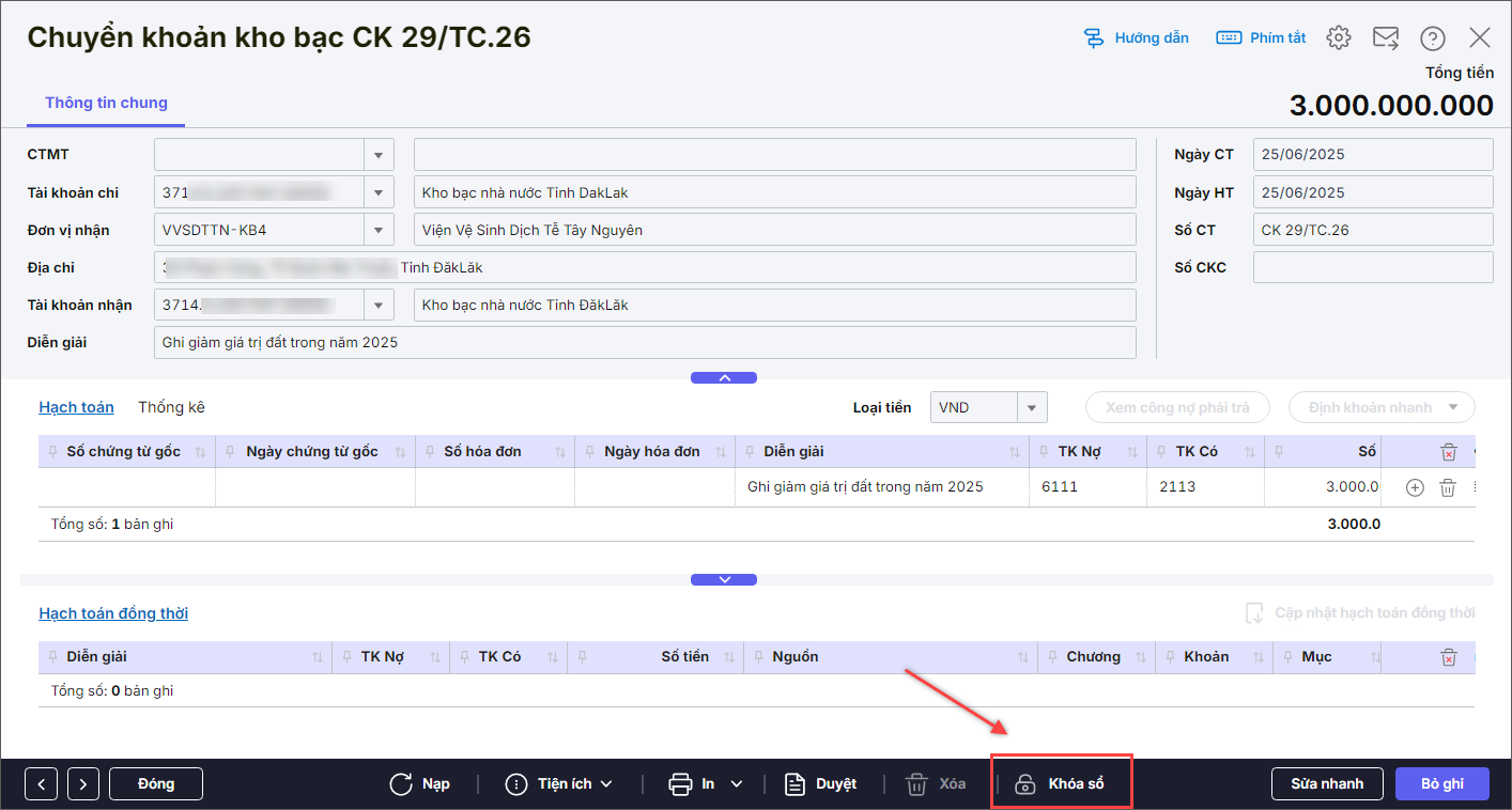 Bước 2: Trên giao diện chứng từ chi tiết, anh/chị có thể nhấn Khóa sổ/Bỏ khóa sổ để thực hiện chức năng tương ứng.