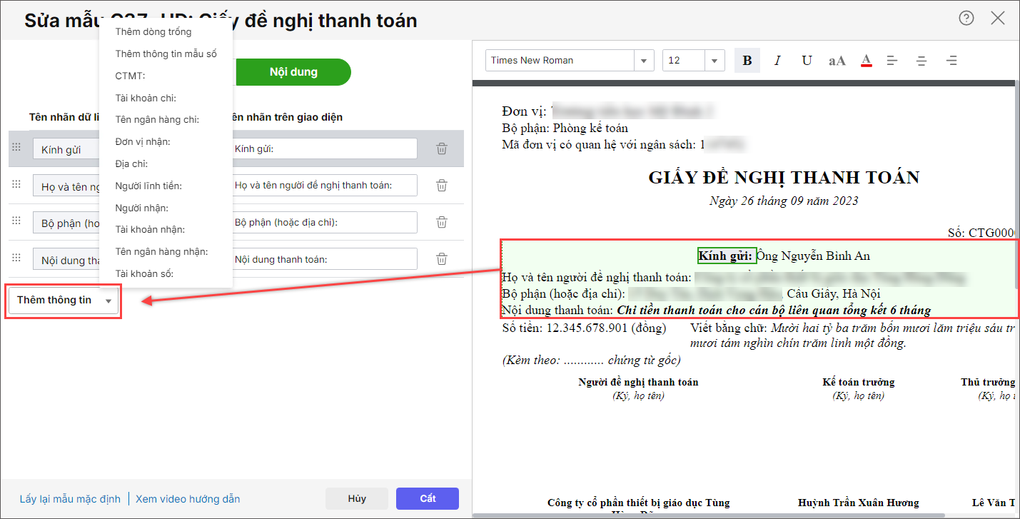 - Khi chọn vào vùng “Kính gửi…”, anh/chị nhấn vào dấu mũi tên ⏷ ở ô thêm thông tin: chọn thêm Tên ngân hàng nhận, Tài khoản chi, Tên ngân hàng chi…