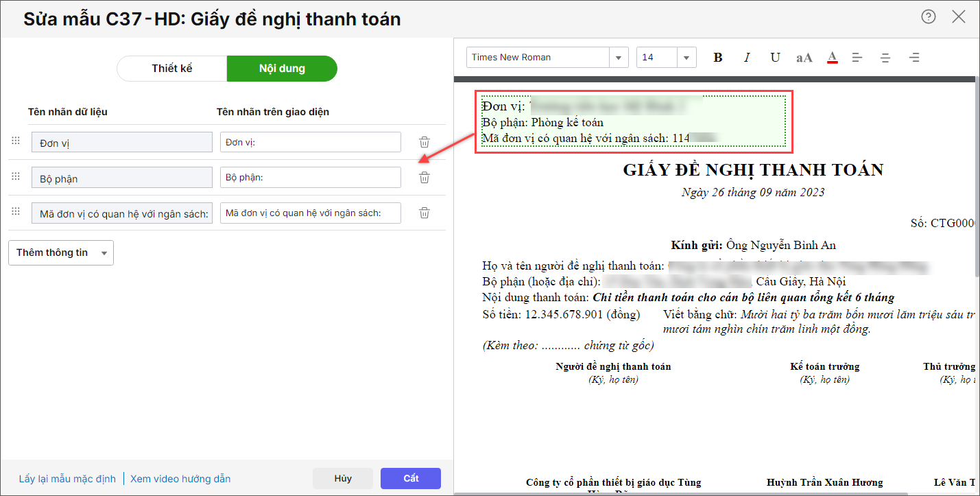 Bài viết hướng dẫn phần mềm cho phép sửa một số thông tin như Tài khoản ngân hàng, Bộ phận….khi sửa mẫu C37-HD: Giấy đề nghị thanh toán, giúp phản ánh đầy đủ thông tin mà không cần phải xuất excell để sửa.