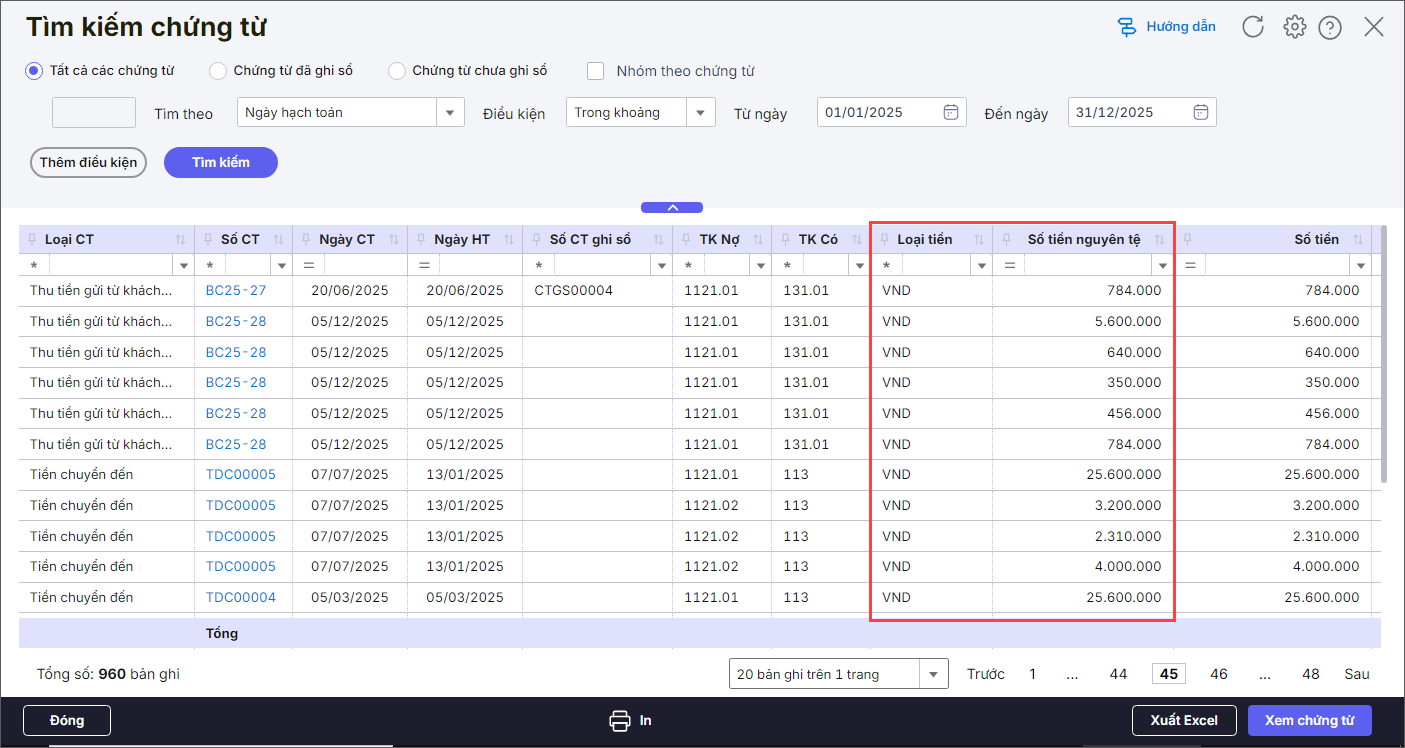 Bước 3: Lọc loại tiền tại cột Loại tiền, kiểm tra số tiền nguyên tệ tương ứng tại cột Số tiền nguyên tệ.