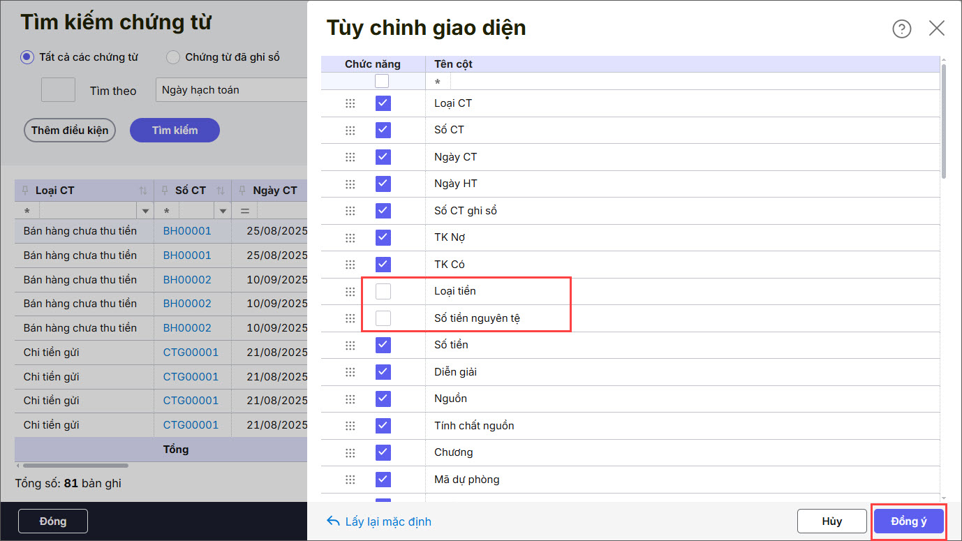 Bước 2: Bỏ tích tại ô Loại tiền và Số tiền nguyên tệ. Nhấn Đồng ý.