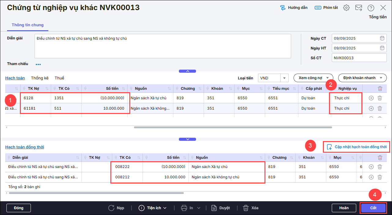 Bước 3: Sau đó nhấn Cập nhật hạch toán đồng thời và nhấn Cất.