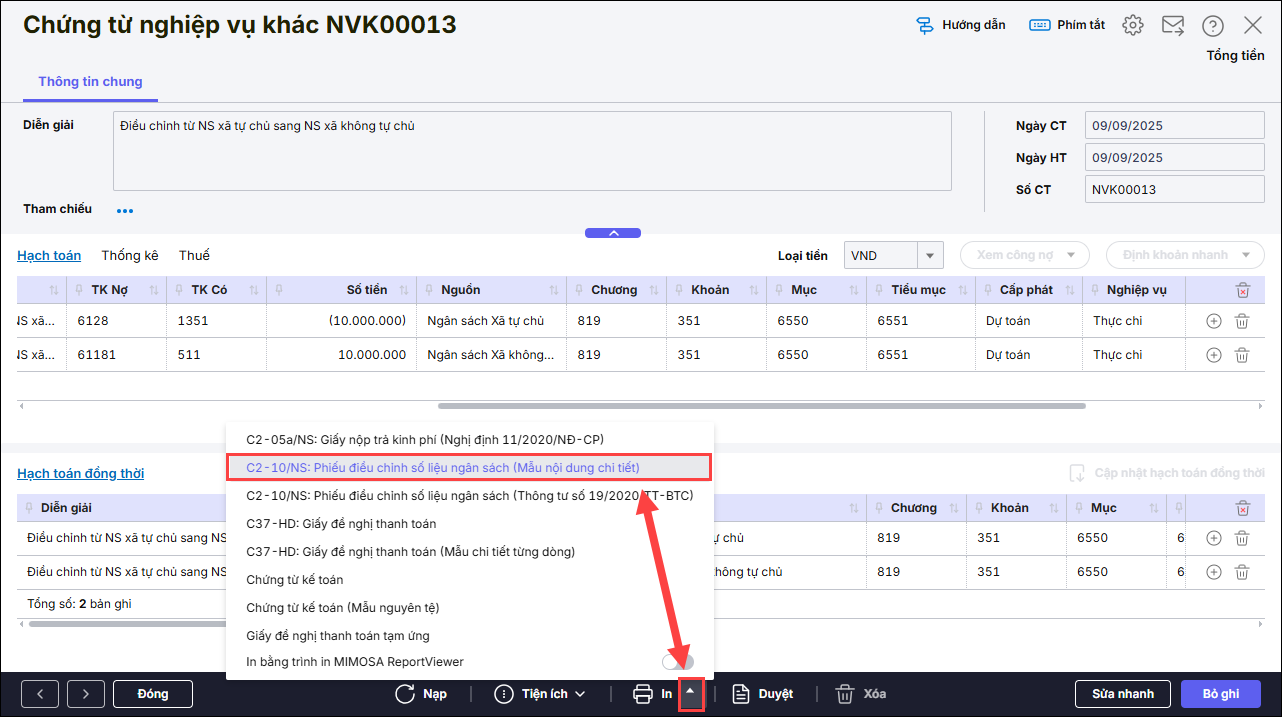 Bước 4: Đơn vị nhấn In/chọn mẫu Phiếu điều chỉnh số liệu ngân sách (C2-10/NS) để làm thủ tục với Kho bạc.