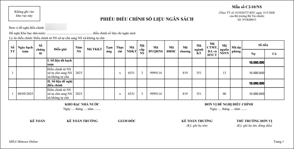 - Bài viết bao gồm hướng dẫn hạch toán và in Phiếu điều chỉnh số liệu ngân sách (C2-10/NS) để làm thủ tục với Kho bạc Nhà nước