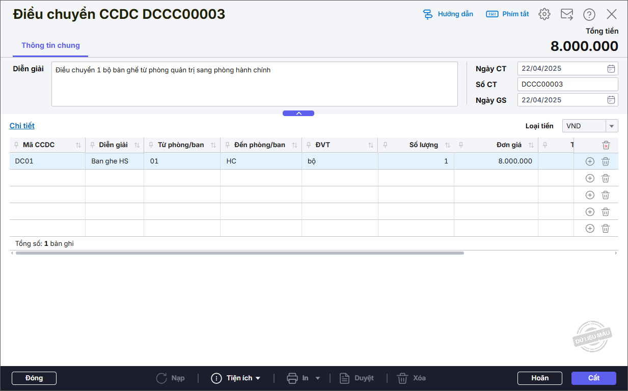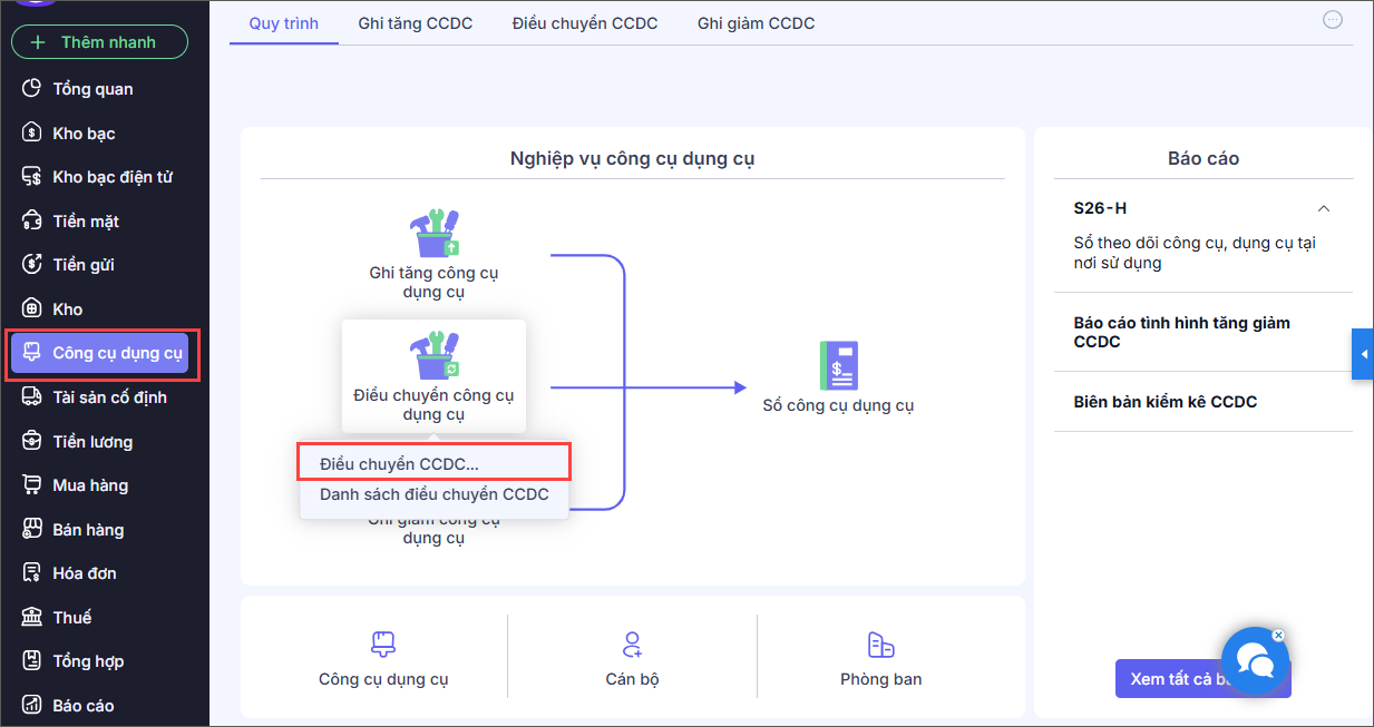 Bài viết hướng dẫn thực hiện điều chuyển công cụ dụng cụ (CCDC) giữa các phòng ban/bộ phận trên phần mềm, đảm bảo quản lý đúng nơi sử dụng và cập nhật kịp thời sổ theo dõi CCDC.