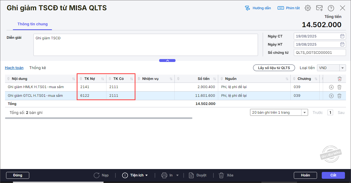 Bài viết hướng dẫn ghi giảm TSCĐ trên MISA QLTS khi nguồn hình thành là nguồn phí được khấu trừ, để lại do tài sản không đủ tiêu chuẩn hoặc có quyết định đánh giá lại, sau đó đồng bộ sang MISA Mimosa Online để hạch toán giảm TSCĐ, tăng CCDC, đảm bảo số liệu và nguồn kinh phí đồng bộ, đúng quy định.