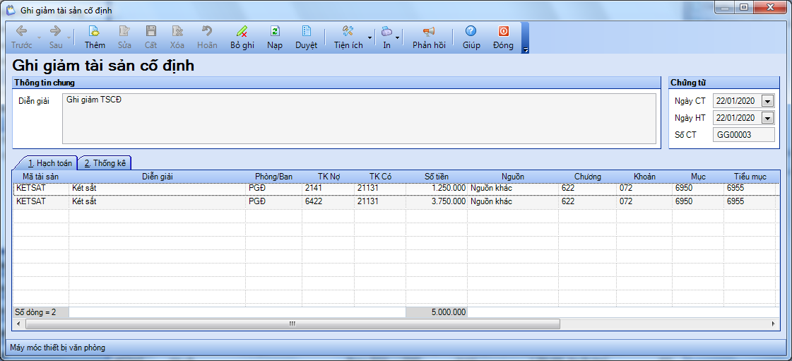 - Nhập thông tin chi tiết tại tab Hạch toán: chọn Mã tài sản cần ghi giảm, điền lại hạch toán Nợ TK 6422 như hình dưới đây
