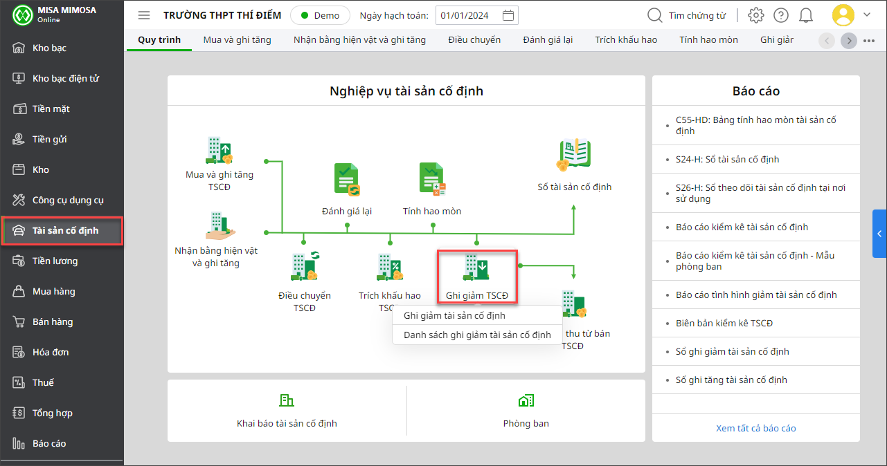 1. Vào nghiệp vụ Tài sản cố định, chọn Ghi giảm TSCĐ\Ghi giảm.