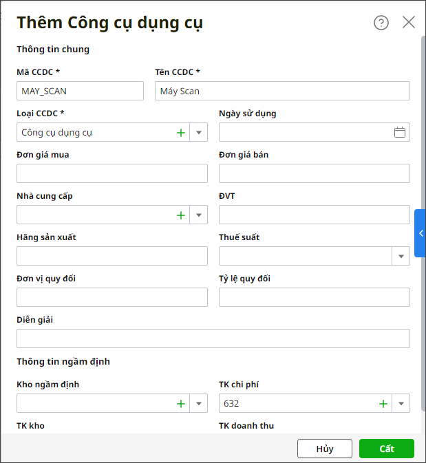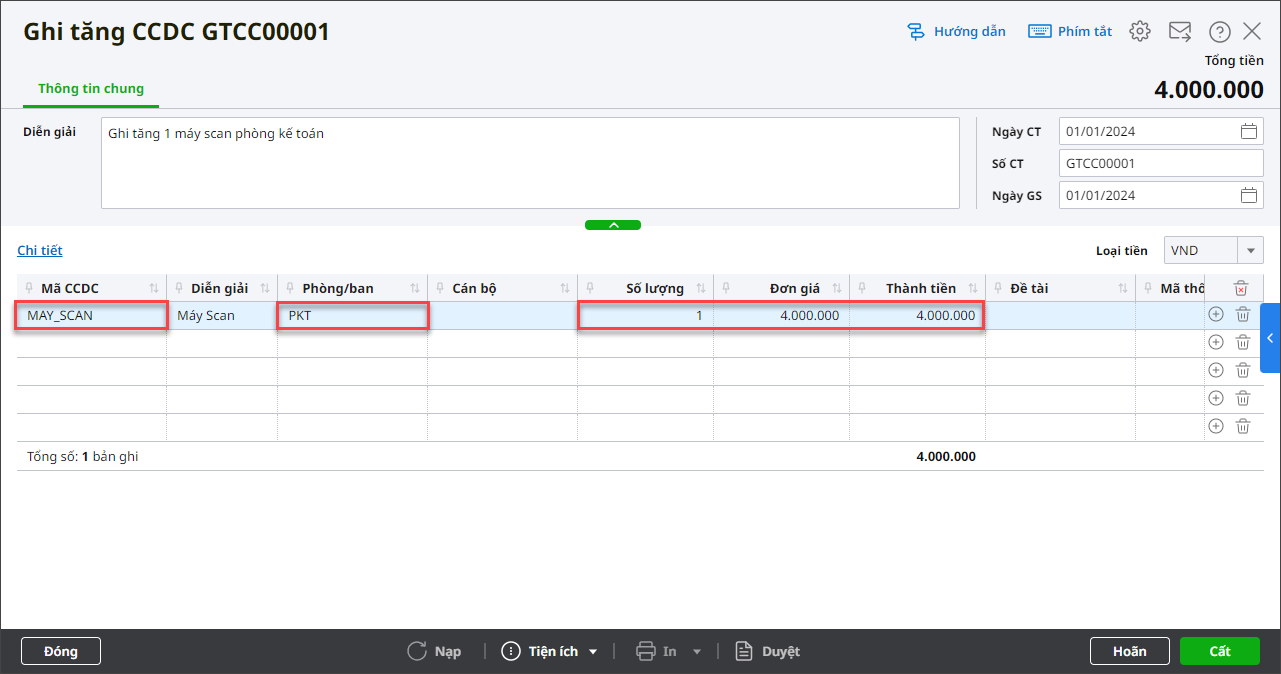 3. Vào phân hệ Công cụ dụng cụ, khai báo công cụ dụng cụ (chính là tài sản được điều chuyển thành CCDC). Xem hướng dẫn tại đây.