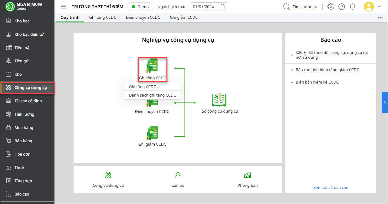 4. Vào phân hệ Công cụ dụng cụ, chọn Ghi tăng CCDC để lập chứng từ Ghi tăng CCDC.