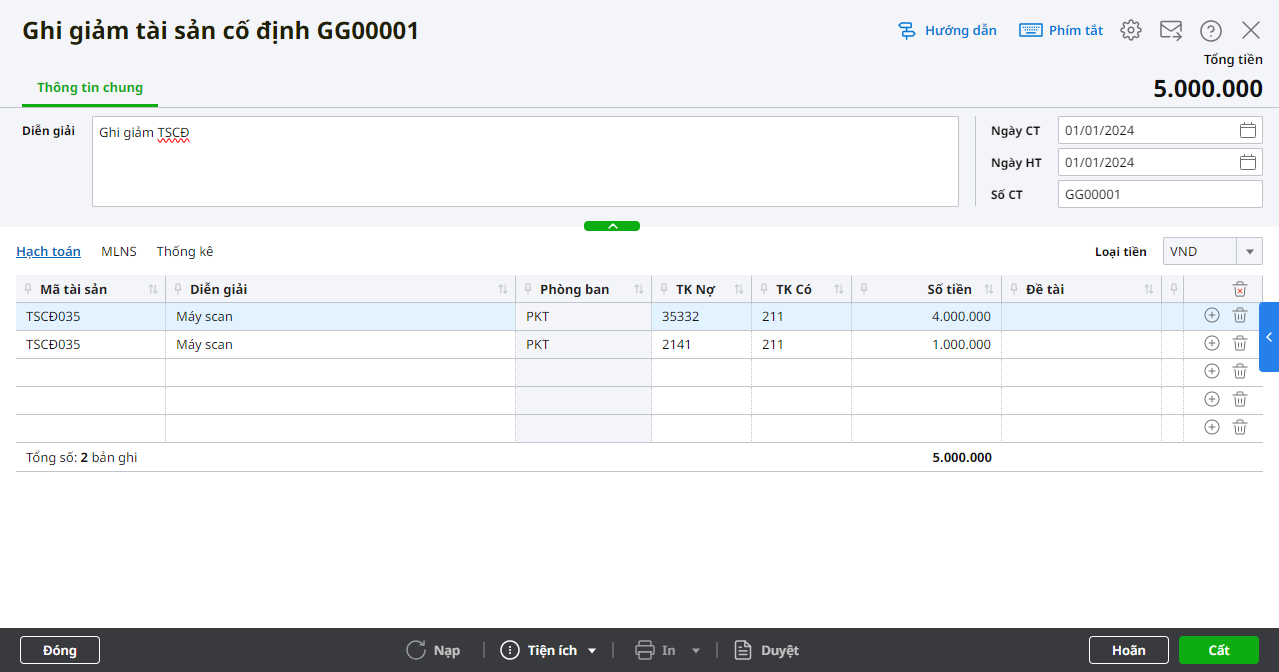 2. Khai báo chứng từ Ghi giảm tài sản cố định: