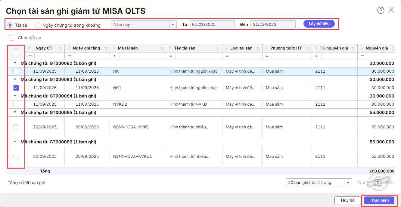 Bước 4: Khai báo thông tin tại màn hình Chọn tài sản ghi giảm từ MISA QLTS.
