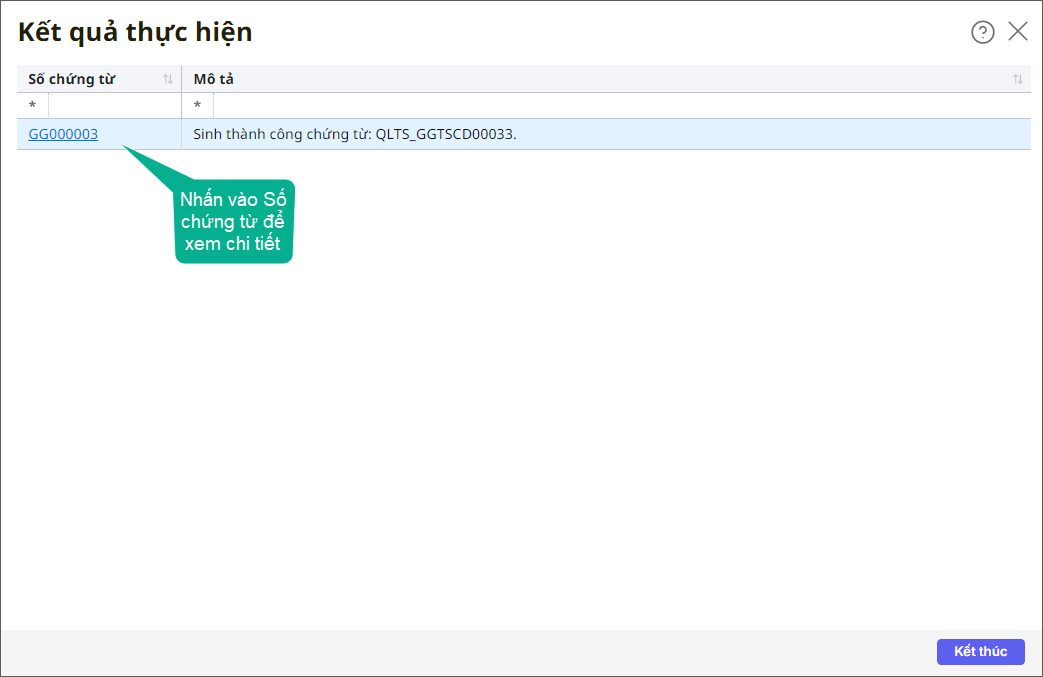 - Nhấn vào Số chứng từ để xem chi tiết chứng từ ghi giảm TSCĐ từ MISA QLTS hoặc nhấn Kết thúc để trở về màn hình danh sách chứng từ.