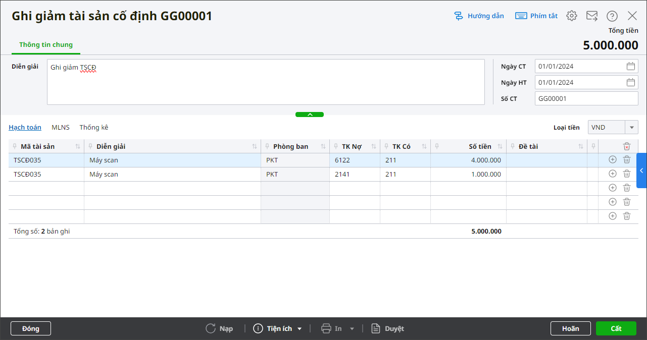2. Khai báo chứng từ Ghi giảm tài sản cố định.