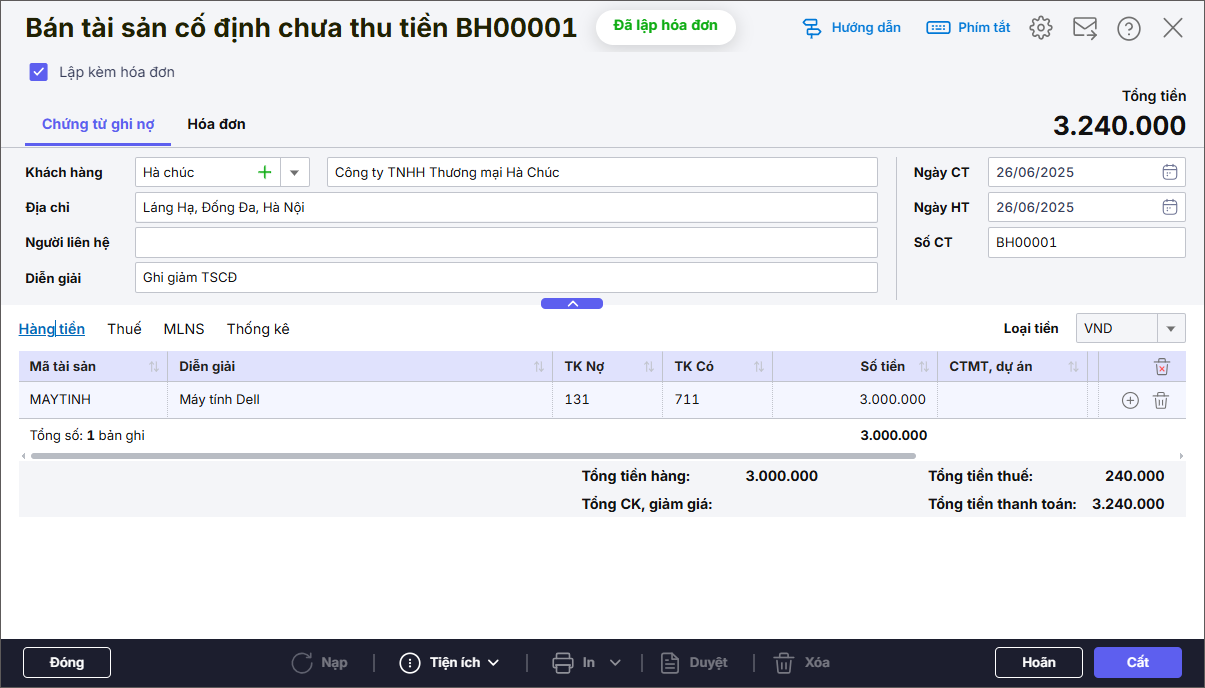 Bước 2: Nhập thông tin trên chứng từ tương ứng. Ví dụ Sinh hóa đơn bán tài sản cố định.