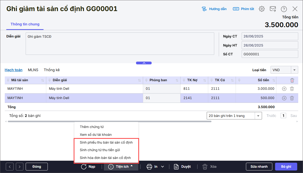 Bước 2: Khai báo chứng từ Ghi giảm tài sản cố định:
